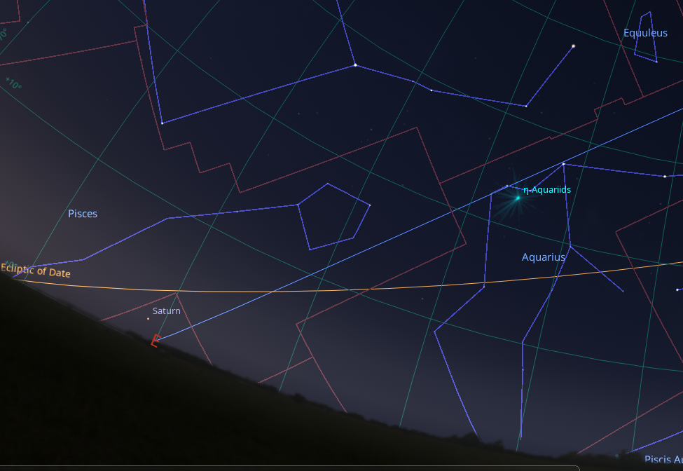 The position of the radiant for the Eta Aquarid meteors. Credit: Stellarium.