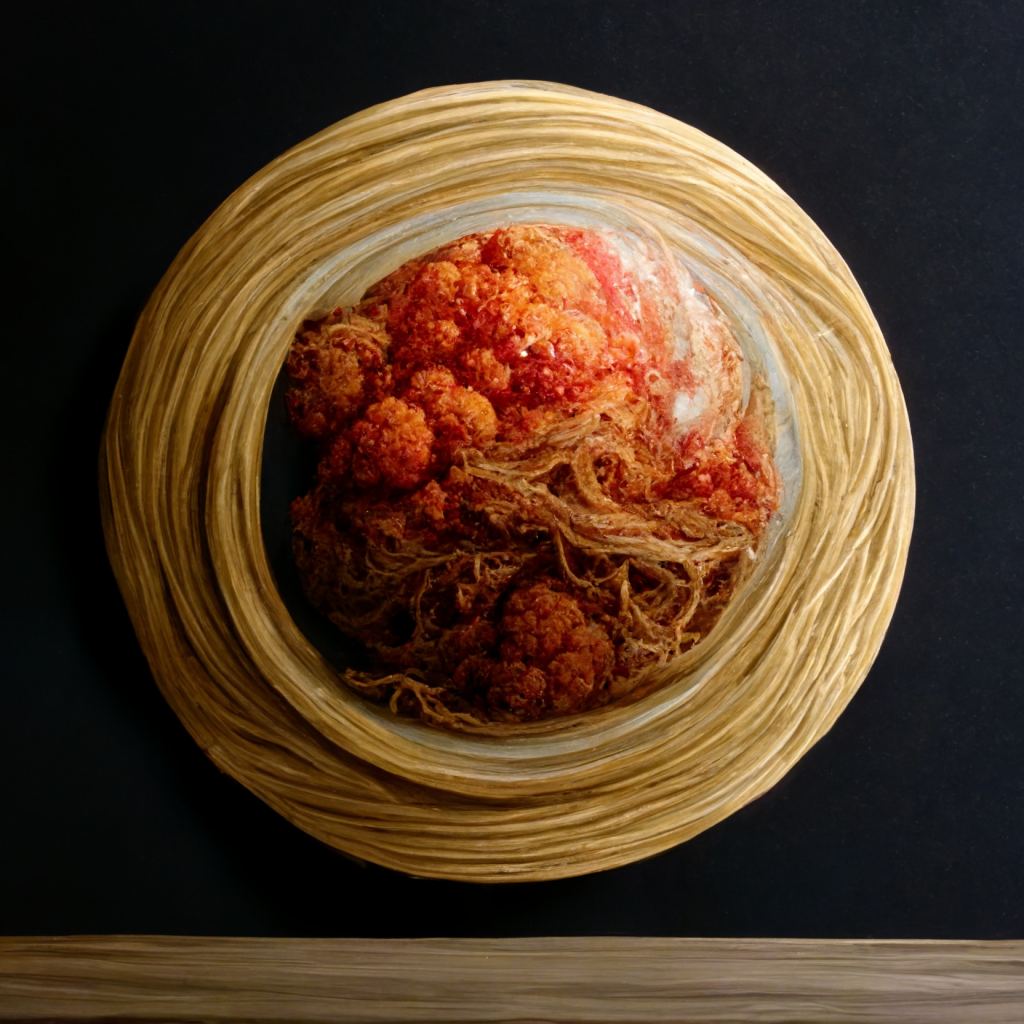 Another great showing from the AI, in my opinion. It's clearly a bowl of spaghetti and meatballs, but the noodles are arranged in a circular pattern that evokes the planet Saturn.