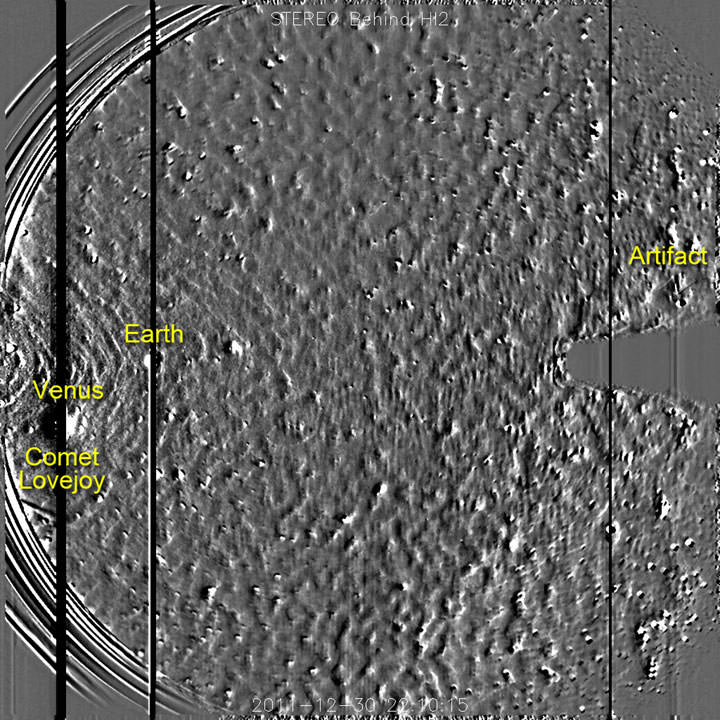.) Just as the weird triangle begins its approach, you'll notice the dazzling Venus enters the field of view of the HI2-B at the same time to the lower left. As you watch, you'll see they keep exactly the same time - in opposite - across the detector image. This isn't just a chance happening... it's a naturally-occurring internal reflection caused by Venus' brilliance in the telescope's optics. It might be exciting for the moment, but it's nothing that hasn't happened in the past. Just check out these great