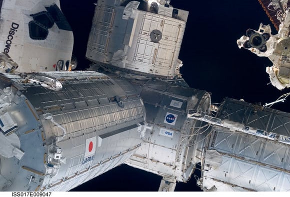 and trying out the latest robotic arm that's part of the shiny new Kibo module. The image above shows some of the new additions to the station, which just keeps growing in size with every mission. The mass of modules shown are: the Japanese Pressurized Module (left), the Japanese Logistics Module (top center), the Harmony node (center), the Destiny laboratory (right) of the ISS, and the forward section of Space Shuttle Discovery that is docked to the station.