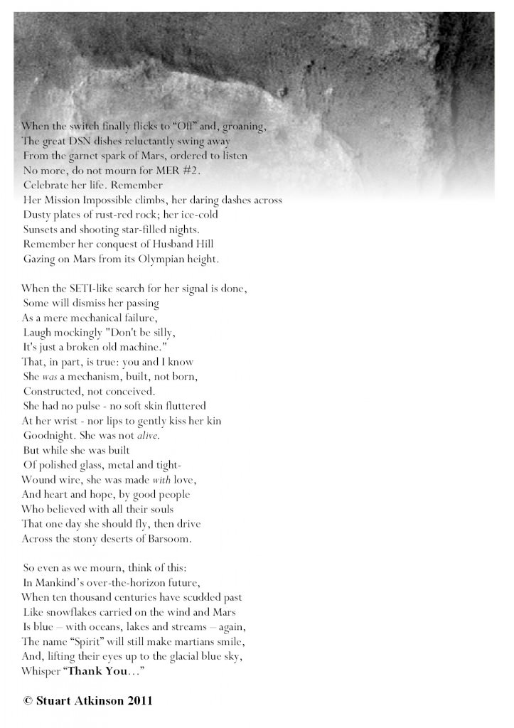 member of UMSF, poet and writer penned this poem about the end of Spirit's mission. You can also read a short story he wrote about a year ago of what could have happened in some households when Spirit died.