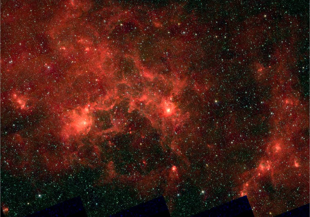 By employing the New Technology Telescope at the European Southern Observatory in Chile, the researchers gathered as much light as possible from a small collection of stars. From this point, they calculated the amount of light each star emitted across the spectrum to determine how many were massive. At least twelve were of the highest order, with a few measuring out to be around a hundred times more massive than the Sun. Before researching the area with a ground-based telescope, Rahman used the WMAP satellite to study the microwave band. There he encountered the glow of the heated gas shell. Then it was Spitzer time... and the imaging began in infra-red.
