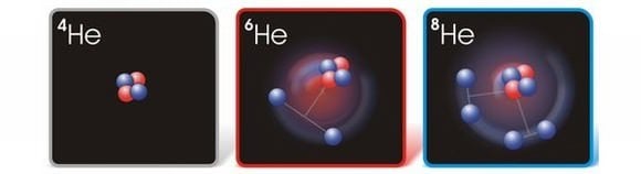 isotopes, helium-6 (four neutrons) and helium-8 (six neutrons). In the unstable isotopes, the additional neutrons form a "halo" around the compact central core (