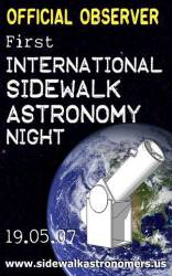 I'm sorry this is such late notice, nobody let me know this was happening. Although sidewalk astronomers have been hitting the streets in the US for years, Saturday, May 19, 2007 is going to be the first International Sidewalk Astronomy Night.
