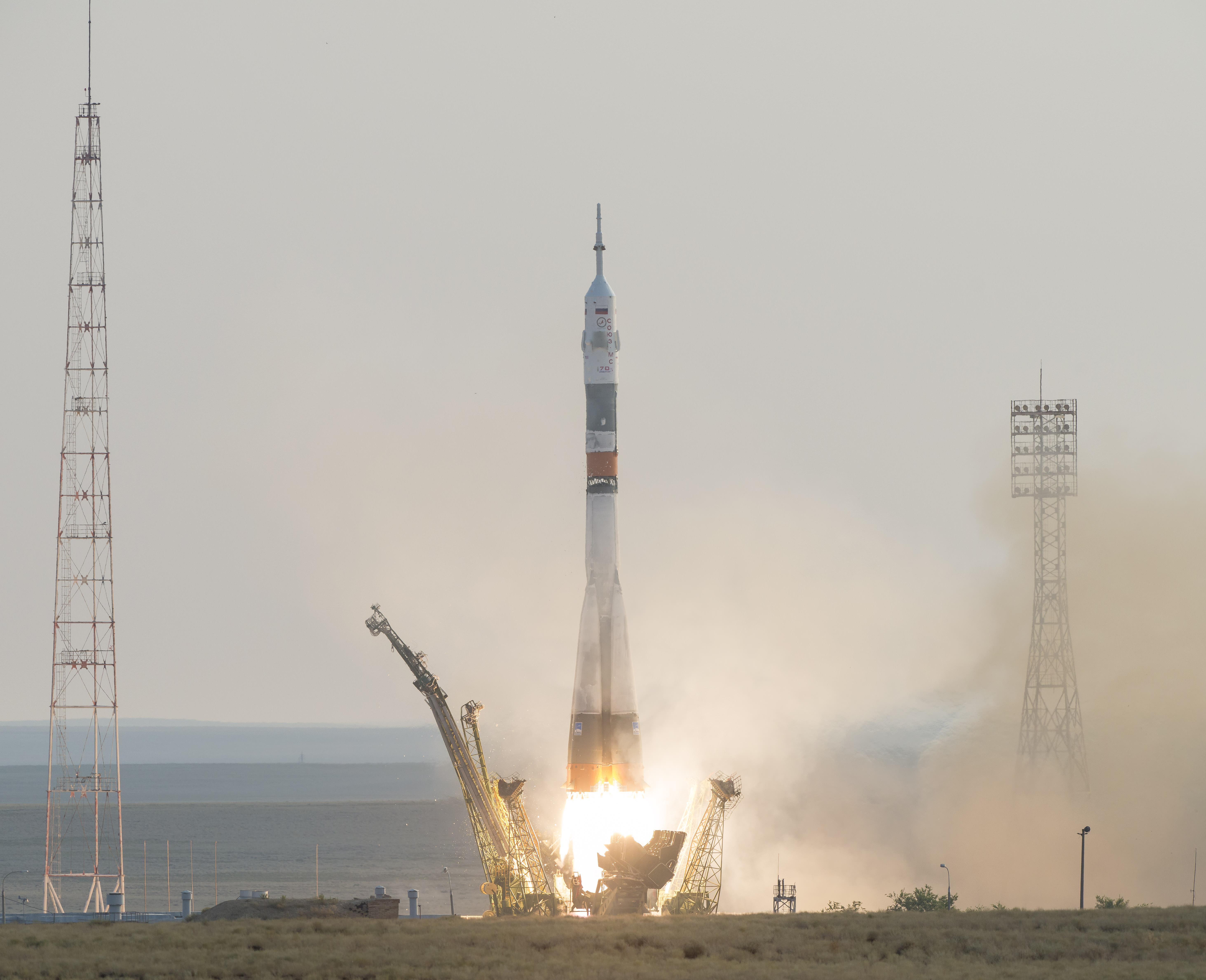 The Soyuz MS-01 spacecraft launches from the Baikonur Cosmodrome with Expedition 48-49 crewmembers Kate Rubins of NASA, Anatoly Ivanishin of Roscosmos and Takuya Onishi of the Japan Aerospace Exploration Agency (JAXA) onboard, Thursday, July 7, 2016 , Kazakh time (July 6 Eastern time), Baikonur, Kazakhstan. Rubins, Ivanishin, and Onishi will spend approximately four months on the orbital complex, returning to Earth in October. Photo Credit: (NASA/Bill Ingalls)[/caption]