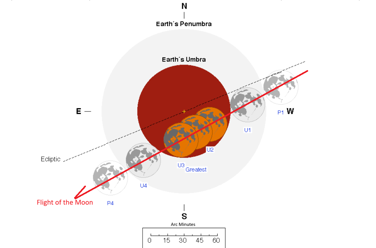 First contact with the inner umbral shadow (U1) marks the start of partial phases of the eclipse. The Earth’s shadow is three times the size of the Moon at the same distance. You’re seeing the curve of the Earth revealed in its shadow, visible proof that the planet you’re standing on is indeed round.