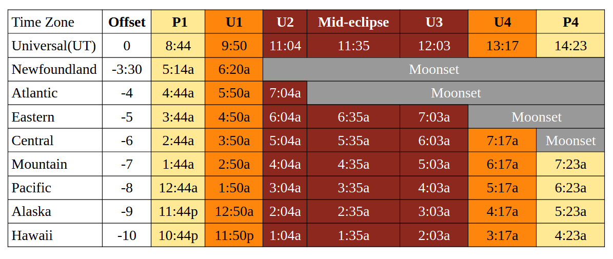 Times for key events for Tuesday's total lunar eclipse. Credit: Dave Dickinson.