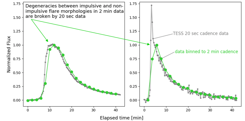at 2 min cadence," the authors write in their paper. "Higher-cadence observations also remove degeneracy present at 2 min cadence between significantly different flare morphologies," they say when discussing the above figure.