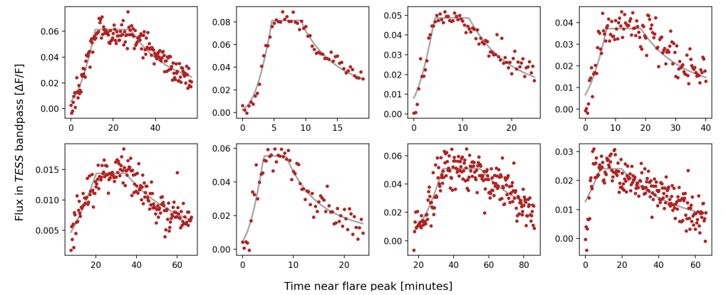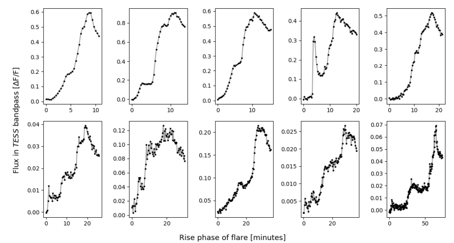 Astrophysicists describe stellar flares in two phases: the rise phase between the beginning of the flare and peak brightness and the decay phase. "Many large flares exhibit complex substructure during the rise phase," the authors write, and the 20-second cadence helps reveal the complexity, while the slower cadence doesn't. "We find 46% of the large flares in our sample exhibit complex structure in the rise phase (201 out of 440 flares), making this a common phenomenon at the 20-second cadence."