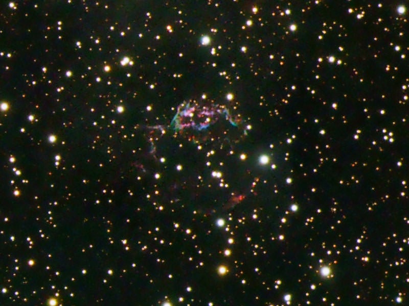 All the colors in the image indicate the various parts of the explosion. The scene is pretty confusing at first. Astronomers are still working to figure out all the different sources of emissions in the remnant. The orange and red-hued material indicates emission from the warm outer shell. The tendrils are the starstuff rushing away from the collapsed core. They are bright pink and studded with knots and clumps. There's a mix of elements generated in the star and by the explosion—including oxygen, neon, and argon. There is a collection of wispy star material closer to the center of the explosion site. The most prominent is a giant green loop that the team nicknamed the "Green Monster". It's an unexpected feature and nobody's quite sure how or why it formed.