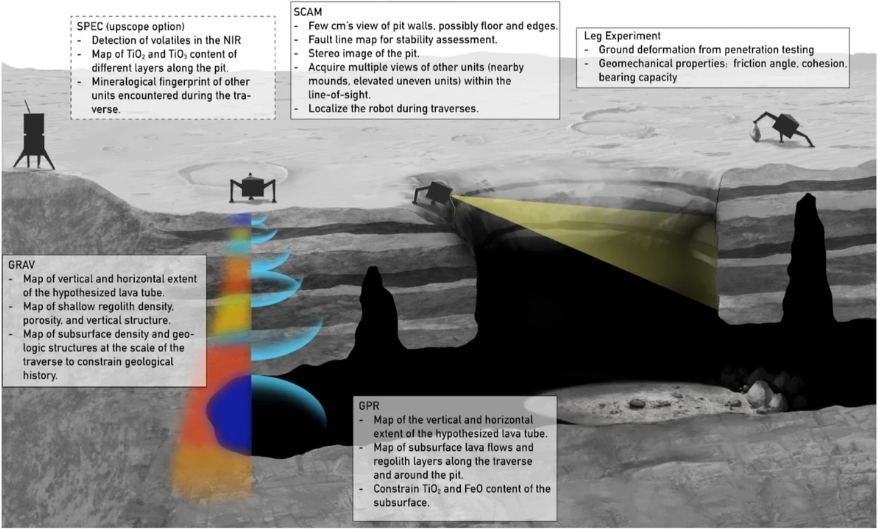 The Leaper would move around the rim of the MHP, capturing images of the pit walls and the floor. It would also use its suite of scientific instruments to gather pertinent data. Its instrument suite would include a gravimeter, a ground-penetrating radar, a dedicated science camera, and hopefully a spectrometer.
