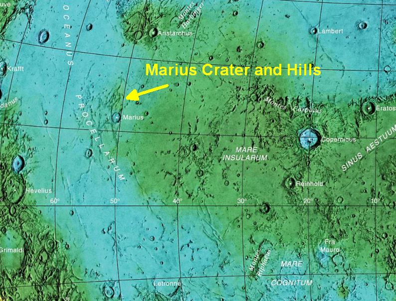 The LunarLeaper team proposes a mission to the Marius Hills region. It's a region in Oceanus Procellarum, a vast lunar mare on the near side of the Moon. It's a volcanic region covered in basalt floods from ancient volcanic activity. Marius Hills is named after the 41 km (25 mi) diameter crater Marius and is littered with volcanic features like rilles, domes, and cones.