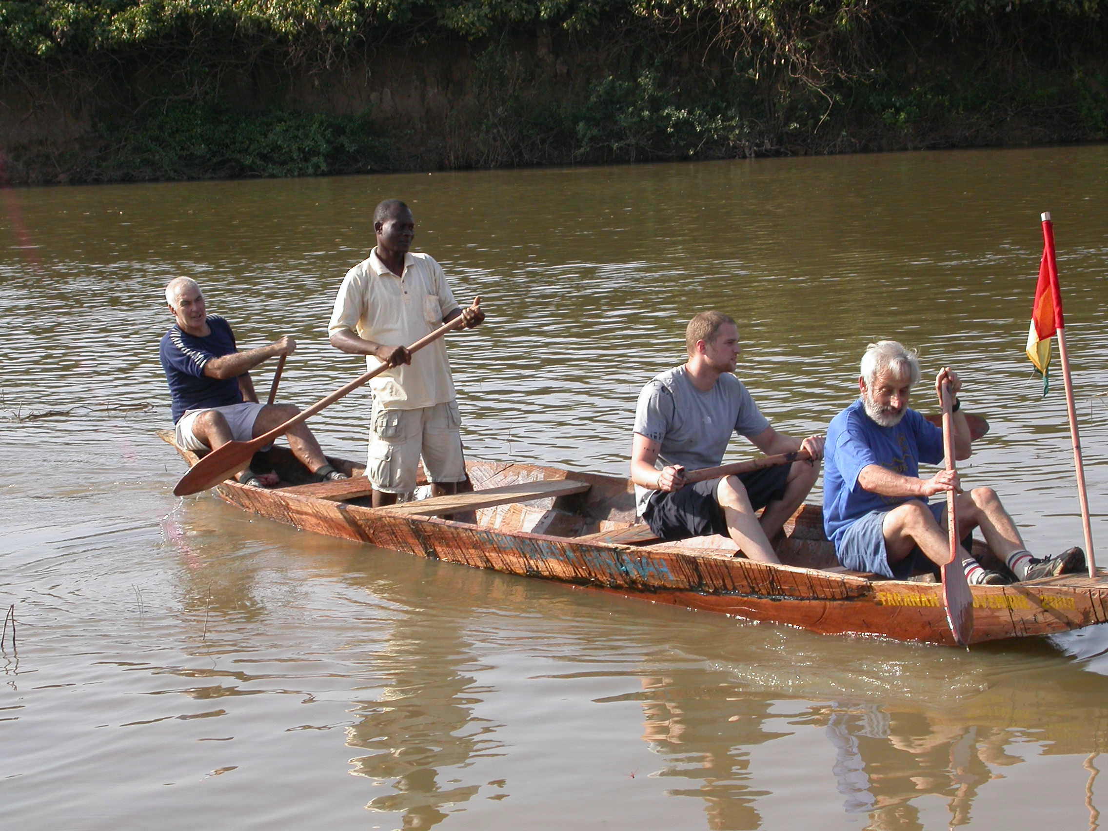 In the morning we set off again and the river was pretty easy to paddle until the canoe came to an abrupt halt. Geoff at the stern of the craft flew into the air Mike at the bow shouted hippo and we all ended up in the river. A 3 ton Bull Hippo had hit us like a submarine launched missile. As we are all lifeguards we swam the canoe to side and emptied out. It was too badly damaged to go on so we were forced to walk out of the jungle through razor edged elephant grass considered impenetrable by many. After five days we reached a small village and safety. At many times I felt that we were caught in a 19th century "ripping yarn for boys". The jungle was very uneven with deep run off channels hidden by the grass. We all fell more than once, however we never even opened a Band Aid in the whole time we were in West Africa.