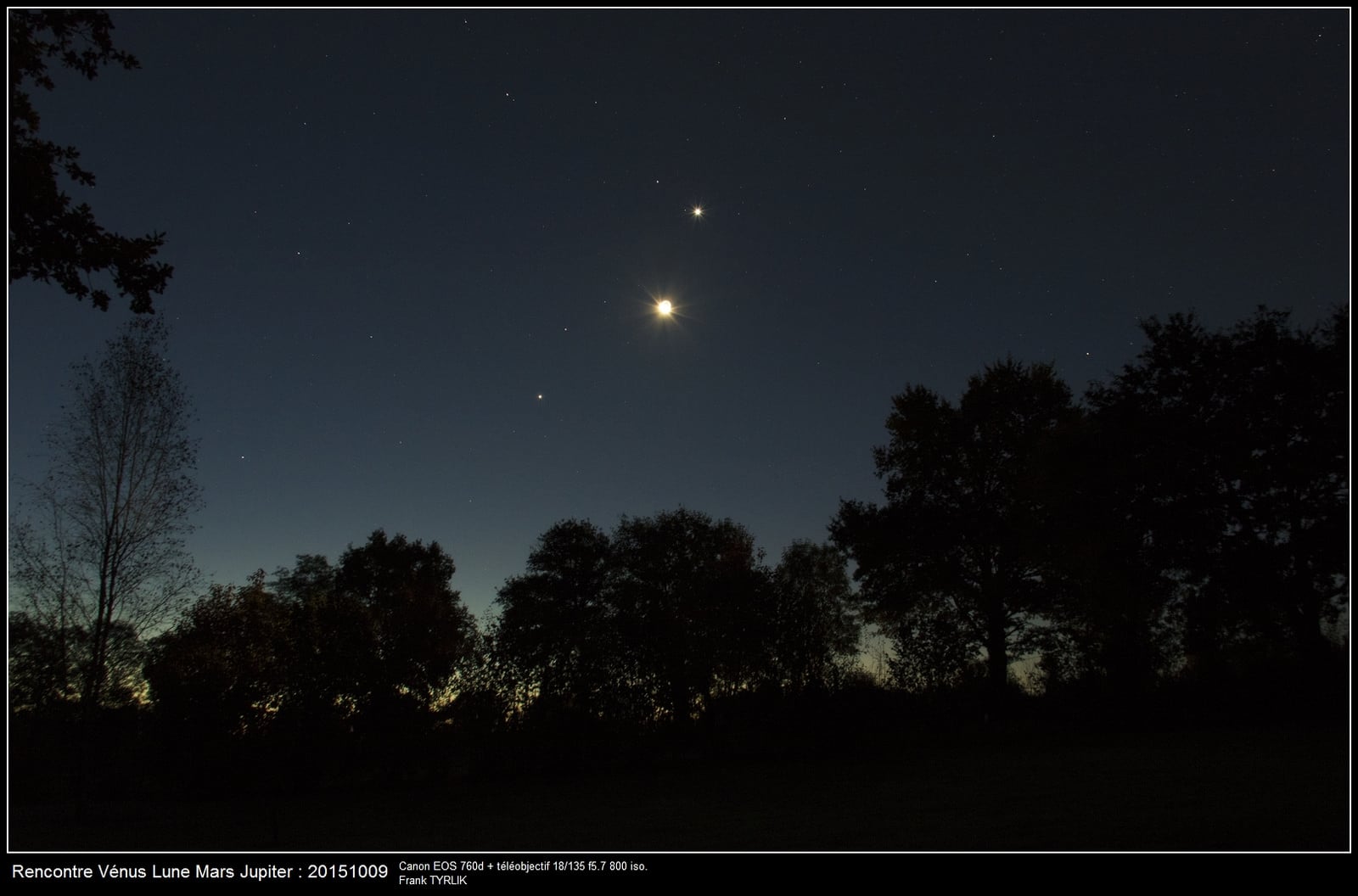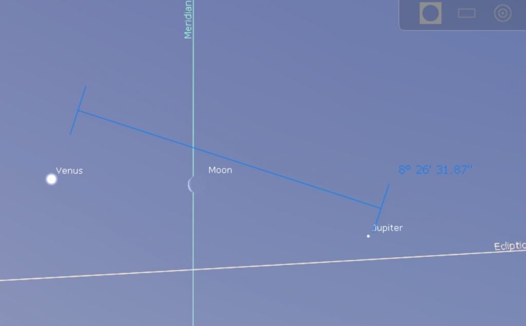 Of course, this close pass is an illusion, a product of our Earthbound perspective. Venus is interior to the Earth's orbit around the Sun and only 0.798 Astronomical Units (AU) distant this month (that's 150 million kilometers or just over eight light-minutes away), while Jupiter is 5.979 AU or 894 million kilometers or 50 light-minutes away.