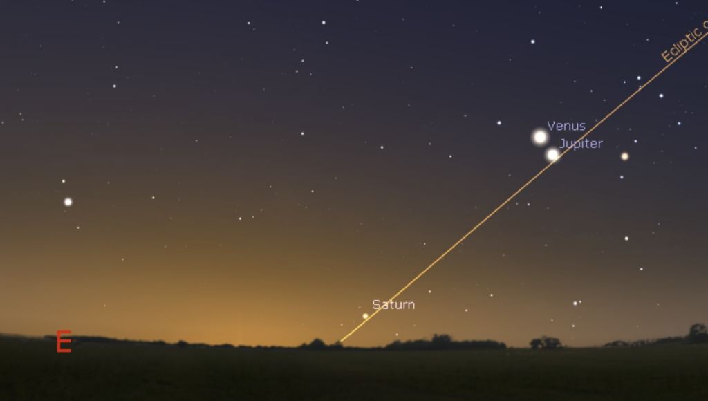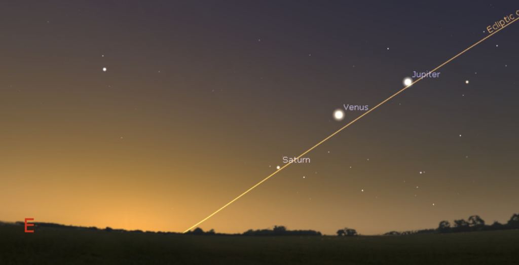 But wait, there's more. The planet Saturn is fresh off of solar conjunction on the far side of the Sun on January 2nd, and the three planets form a nearly straight line trio of Saturn-Venus-Jupiter on the morning of February 6th. Venus then goes on to pass just 1.1 degrees north of Saturn on the morning of February 18th.