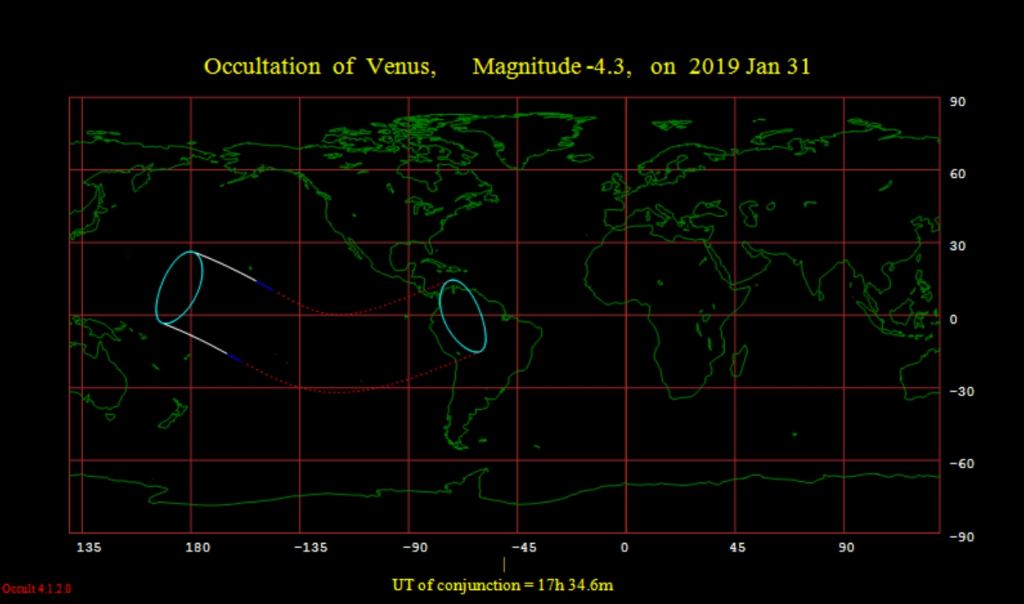 The waning gibbous is also Moon fresh off of next week's total lunar eclipse, and joins the action on January 30th through February 1st. The Moon actually occults (passes in front of) Venus for the central Pacific region on the morning of January 31st.