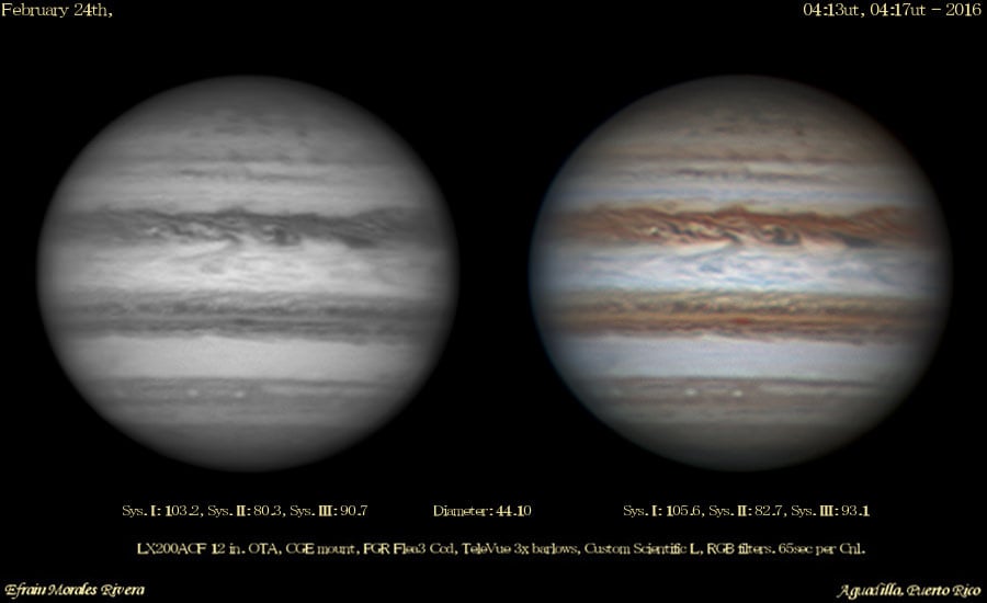 Jupiter + red spot, imaged on February 16th, 2016. Image credit and copyright: