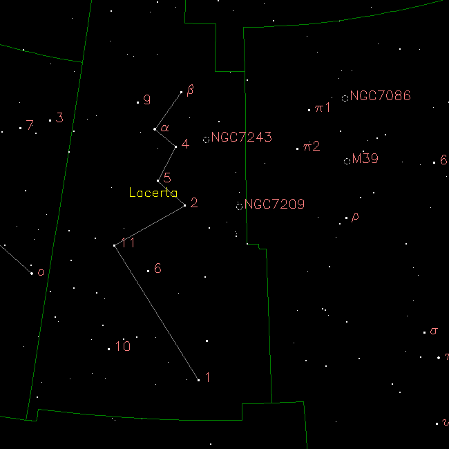, a 56 page atlas created by Hevelius, which outlined seven new constellations which survived time - and many which did not. Positioned north of the ecliptic plane, it spans 201 square degrees of sky and contains 5 main stars in its asterism and 17 Bayer/Flamsteed designated stars within its boundaries. Lacerta is bordered by the constellations of Andromeda, Cassiopeia, Cepheus, Cygnus and Pegasus. It is visible to all observers at latitudes between +90° and ?90° and is best seen at culmination during the month of December.
