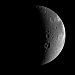The image was taken in visible light with the Cassini spacecraft narrow-angle camera on Aug. 25, 2005, at a distance of approximately 1.1 million kilometers (700,000 miles) from Dione and at a Sun-Dione-spacecraft, or phase, angle of 107 degrees. Resolution in the original image was 7 kilometers (4 miles) per pixel. The image has been magnified by a factor of two and contrast-enhanced to aid visibility.