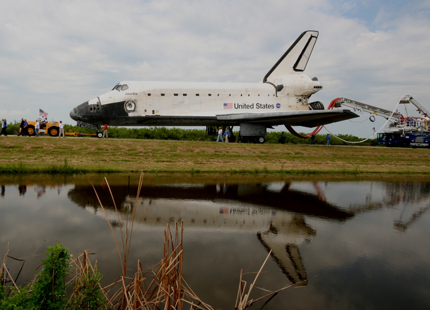 [caption id="attachment_87817" align="aligncenter" width="580" caption="Atlantis towed nose first from runway 15 at the Shuttle Landing Facility at KSC.