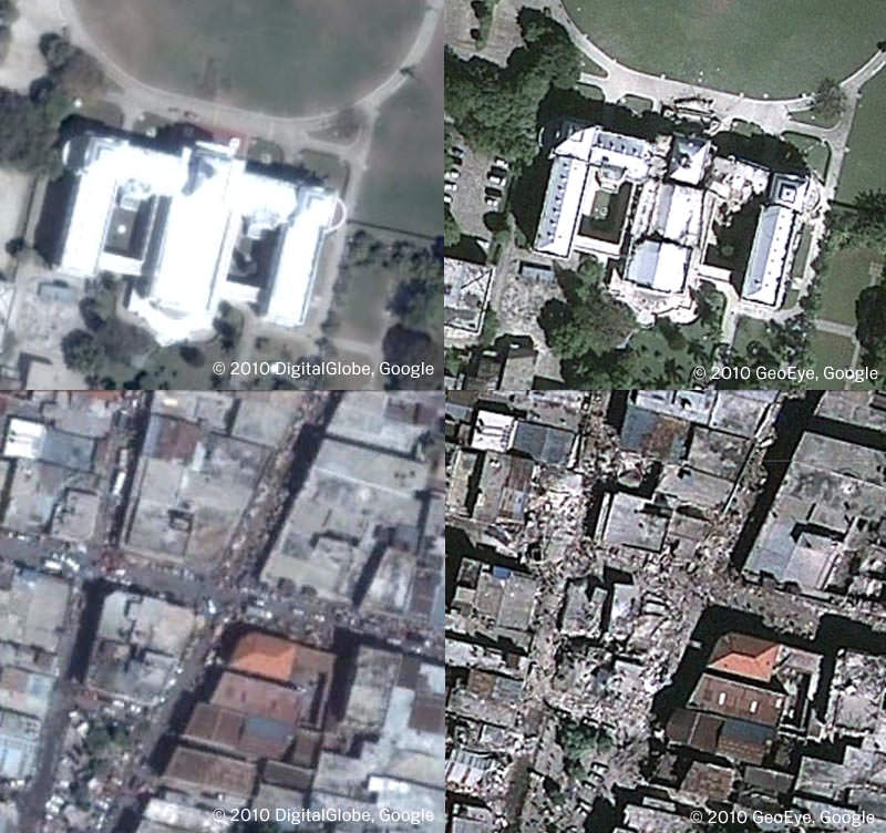 and open it in Google Earth. You can also open the file in Google Maps. As you'll see, the imagery shows a powerful glimpse into the destruction in Haiti. Above are before-and-after screenshots of the Presidential Palace and an area of Port-au-Prince.