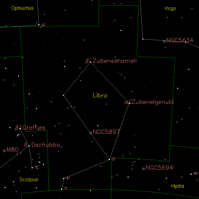 Libra is a constellation of the zodiac, positioned on the ecliptic plane between between Virgo to the west and Scorpius to the east. It is a faint group of stars and not easy to recognize. Its two major stars once once represented the claws of Scorpius. How and when it came to be recognized by its present designation is unknown. Libra covers approximately 538 square degrees of sky and contains 6 stars in its asterism. There are 46 Bayer Flamsteed designated stars within Libra and it is bordered by Serpens Caput, Virgo, Hydra, Centaurus, Lupus, Scorpius and Ophiuchus. Libra can be seen by all observers at latitudes between +65° and ?90° and is best seen at culmination during the month of June.