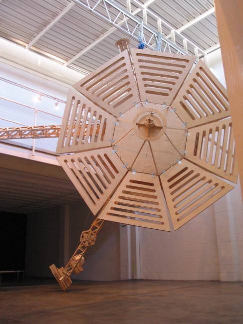This life size 're-enactment' of the Hubble Space Telescope was constructed "with the aim of giving the viewer a physical experience of the object." It is constructed from lasercut plywood and steel and simultaneously enacts the scale and detail of the original. This is an interactive sculpture: visitors are encouraged to play with, modify and create their own mini universes on the ground, which are then reflected by the telescope into the heavens.