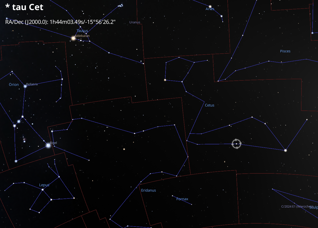 The location of Tau Ceti in the sky. Credit: Stellarium.