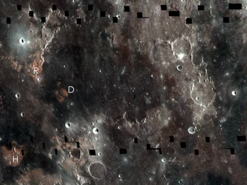 ). "The maria appear reddish in some places and blue in others. Although subtle, these colour variations tell us important things about the chemistry and evolution of the lunar surface. They indicate the titanium and iron abundance, as well as the maturity of a lunar soil."
