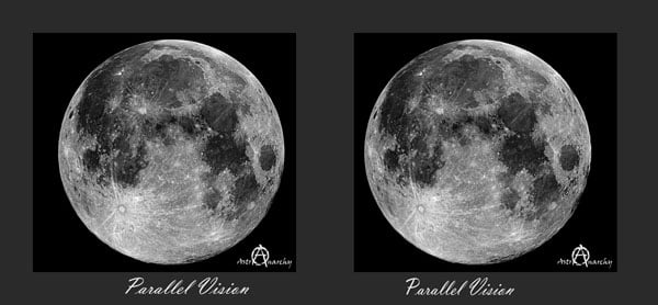 Hey, welcome to my world. You, know, the Full Moon has been credited to many things over the years... werewolves, disasters, fertility, accidents and even crime, suicide and mental illness. Farmers plant their crops by lunar phases and (strangely enough) I've even heard tale that some brokers buy and sell stocks according to phases of the Moon. While it's more myth than fact that seeing Selene in full light has an effect on our human behavior, one thing is for certain... There's nothing like the details you can glimpse on this distant, barren, rocky orb. Chances are, if you're seeing two pictures, then you're about to embark on another stereo journey thanks to the magic of Jukka Metsavaino. Are you ready to take a quarter of a million mile journey? Then let's go...
