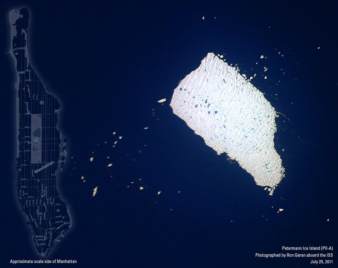 Taken by NASA astronaut and Expedition 27 flight engineer Ron Garan, this image shows the Petermann Ice Island (PII-A) currently adrift off the coast of Labrador. The island is a chunk of ice that broke off the Petermann Glacier in Greenland in August of 2010 and has been moving slowly southward ever since. It is currently about 21 square miles (55 square km) in size – nearly the same area as Manhattan!