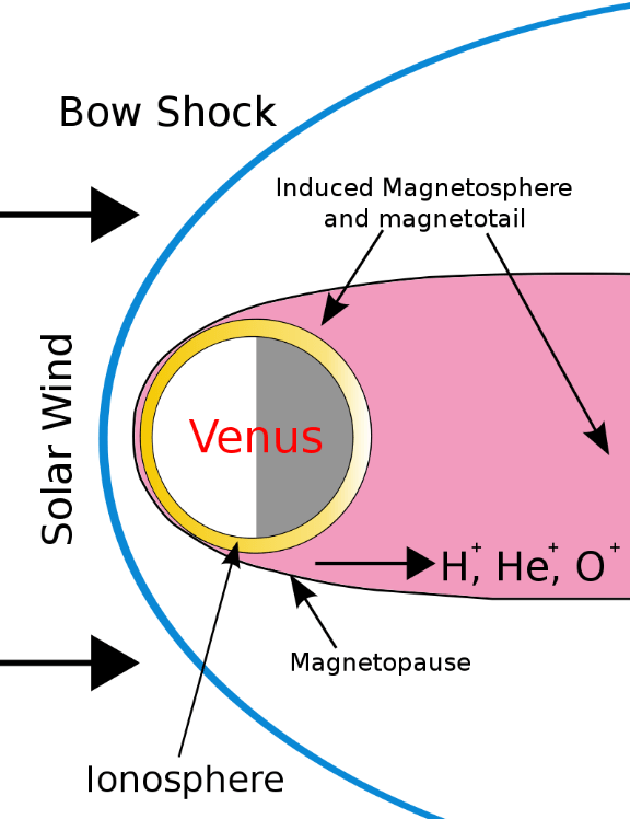 When the ions and electrons in the solar wind collide with this induced magnetic field, some of the ions are directed to flow one way, and some of the electrons are directed the opposite way. That forms electric currents, and they travel around the planet, from dayside to nightside.