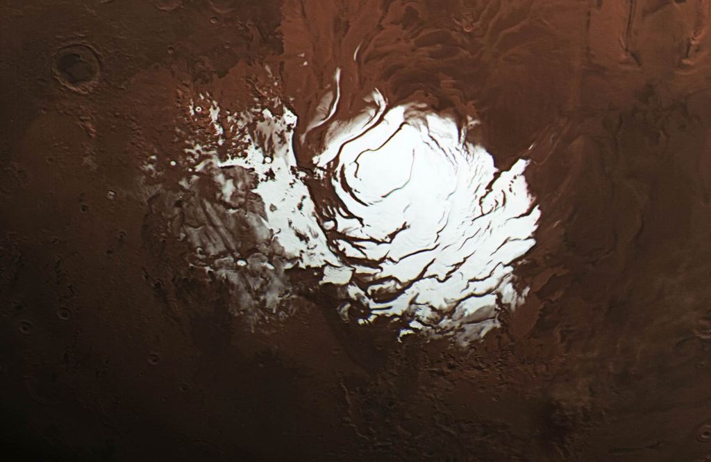 The layered deposits of H2O and CO2 ice can provide a record Mars' climate history, as the south polar ice cap is the only place on the Red Planet where frozen carbon dioxide persists on the surface year-round.