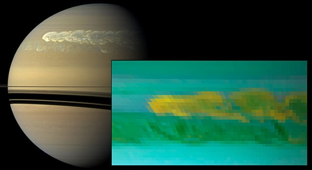 ? It was one of the largest storms ever observed on the ringed planet, and it was even visible from Earth in amateur-sized telescopes. The latest research has revealed the tempestuous storm churned up something surprising deep within Saturn's atmosphere: water ice. This is the first detection of water ice on Saturn, observed by the near-infrared instruments on the Cassini spacecraft.