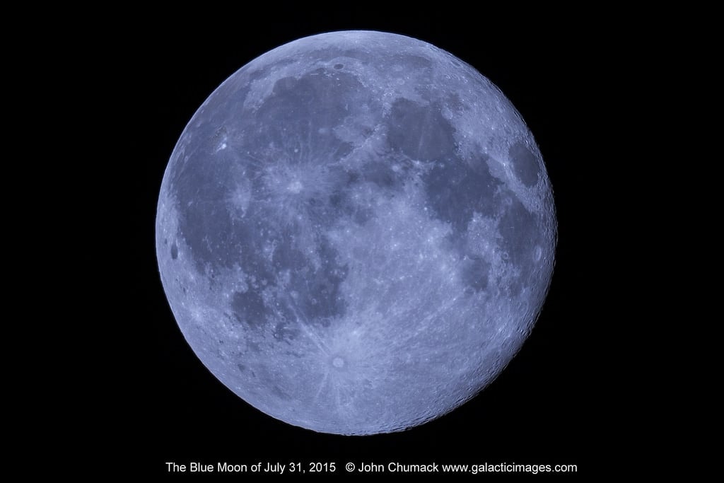 , 1950, the residents of the northeastern United States saw the 94% illuminated waxing gibbous Moon rise with a distinctly bluish cast, owing to the high concentration of oily soot particles suspended high in the atmosphere, scattering out red and yellow light but filtering through blue. Reports of similar Blue Moons dot observational lore, though to our knowledge, no one has actually captured an image of such a cerulean apparition of the Moon.