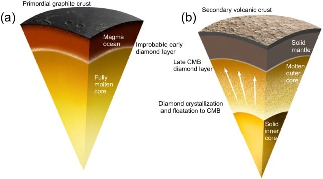 For their study, the team relied on thermodynamic modeling to recreate these pressure conditions based on the existence of a deeper core-mantle boundary. These experiments allowed them to simulate what conditions were like for Mercury as it slowly cooled. Their results indicated that presuming a sulfur content of around 11% and a pressure of roughly 1-2% percent of that in Earth's interior, diamond could crystalize within the molten core. They further found that this diamond would form a layer that could remain stable enough to rise along with graphite towards the mantle.
