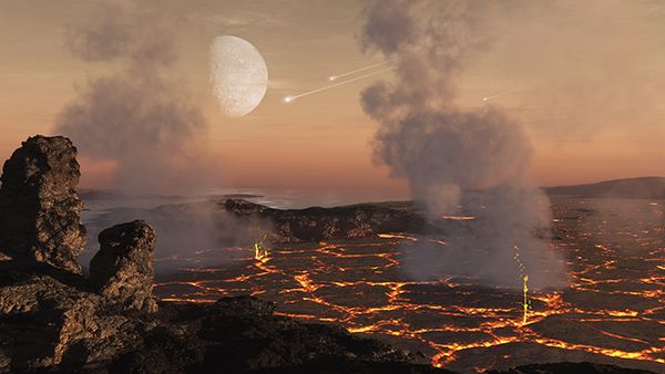 Illustration of an early rocky planet with outgassing forming at atmosphere.
