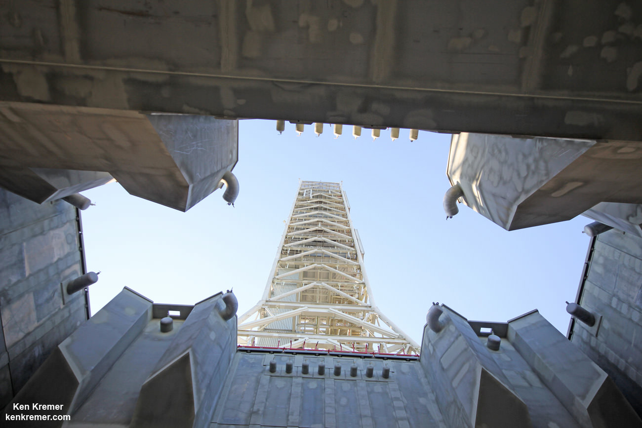 Looking up from beneath the enlarged exhaust hole of the Mobile Launcher to the 380 foot-tall tower astronauts will ascend as their gateway for missions to the Moon, Asteroids and Mars. The ML will support NASA's Space Launch System (SLS) and Orion spacecraft during Exploration Mission-1 at NASA's Kennedy Space Center in Florida. Credit: Ken Kremer/kenkremer.com Story/photos updated[/caption]