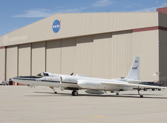 NASA's ER-2 at the Armstrong Flight Research Center's Building 703 in Palmdale, CA (NASA/Tom Tschida)[/caption]