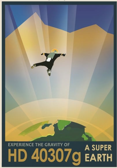 A NASA "travel poster" showing off how fun skydiving would be on HD 40307g, a planet that is somewhere in size between a "super-Earth" or "mini-Neptune." Credit: NASA/JPL-Caltech[/caption]