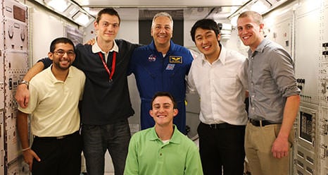Image caption: Mike Massimino (center) poses with the intern video team after filming at JSC. Photo credit: Nicole Cloutier