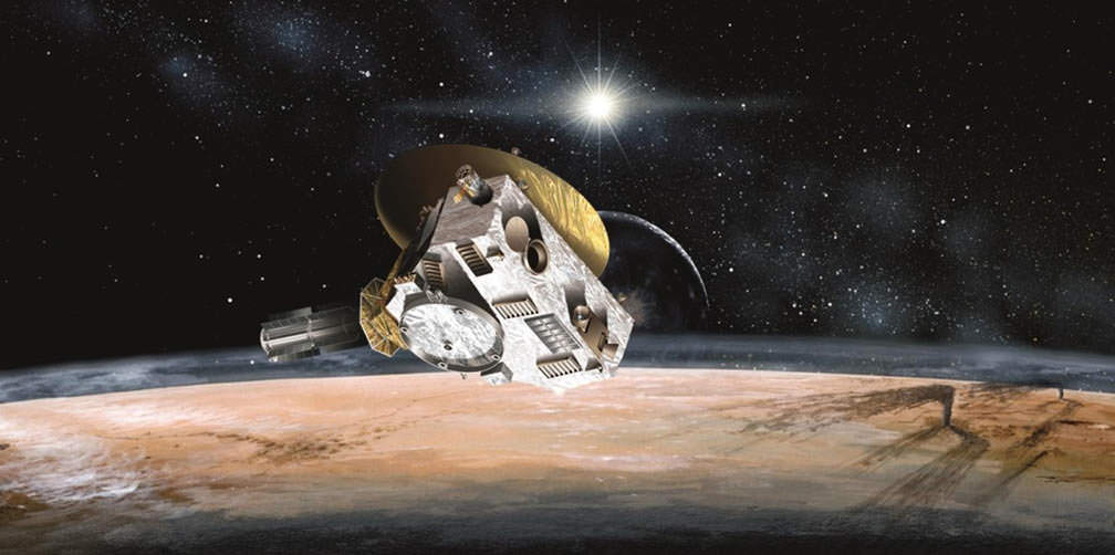 Artist view of New Horizons passing Pluto and three of its moons. The ship is about the size of a grand piano and kept warm by heat released from the radioactive decay of plutonium within the probe's RTG (Radioisotope Thermoelectric Generator). To further retain heat in the frigid cold far from the Sun, it's insulated with multi-layer blankets. Credit: NASA/Johns Hopkins University Applied Physics Laboratory/Southwest Research Institute[/caption]