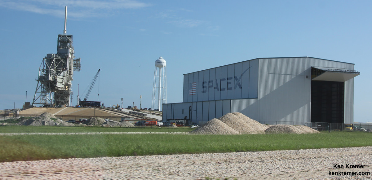 SpaceX Crew Dragon will blast off atop a Falcon 9 rocket from Launch Pad 39A at NASA's Kennedy Space Center in Florida for missions to the International Space Station. Pad 39A is undergoing modifications by SpaceX to adapt it to the needs of the company's Falcon 9 and Falcon Heavy rockets, which are slated to lift off from the historic pad in the near future. A horizontal integration facility (right) has been constructed near the perimeter of the pad where rockets will be processed for launch prior of rolling out to the top of the pad structure for liftoff. Credit: Ken Kremer/Kenkremer.com[/caption]