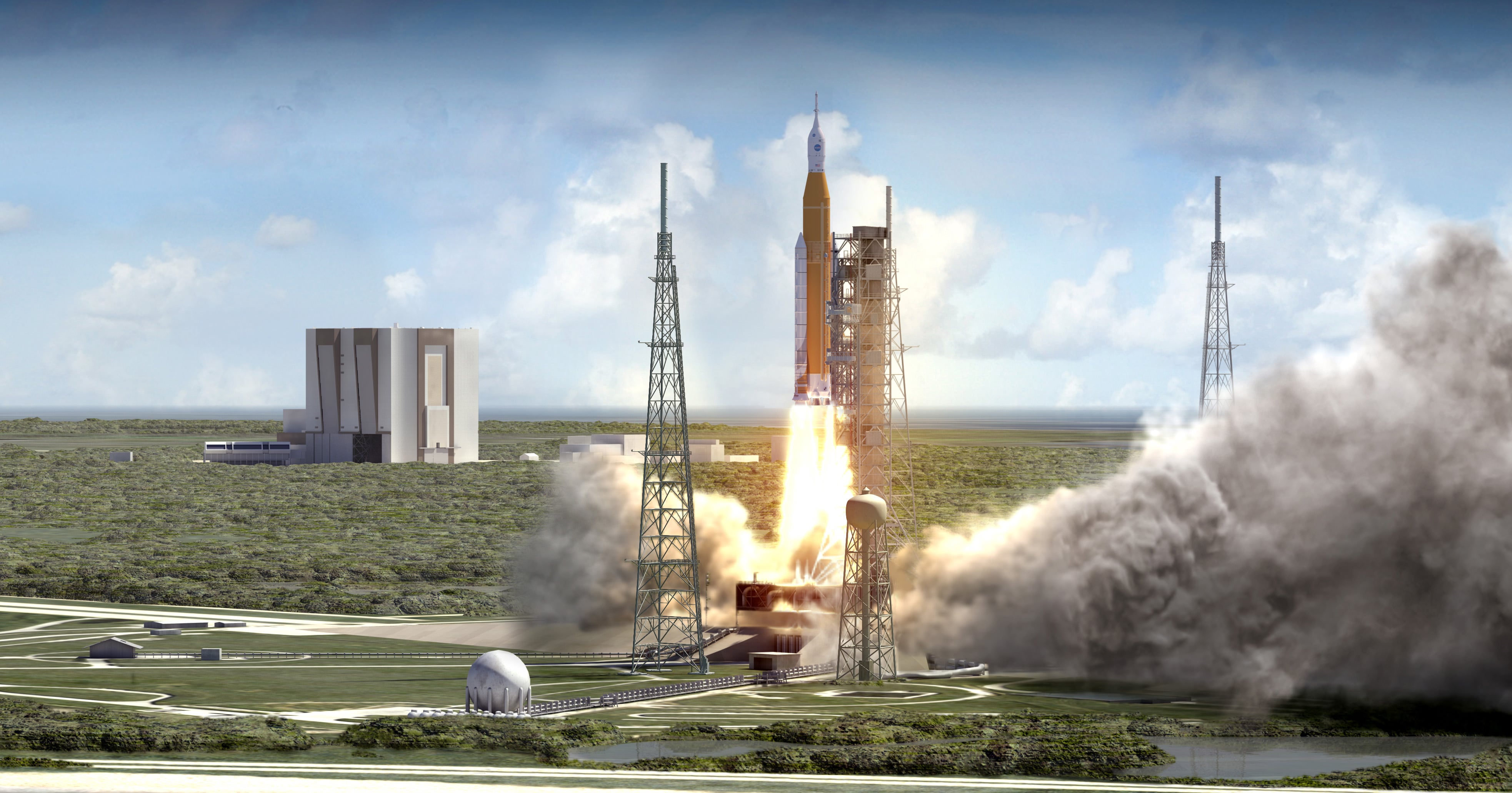 NASA's Space Launch System (SLS) blasts off from launch pad 39B at the Kennedy Space Center in this artist rendering showing a view of the liftoff of the Block 1 70-metric-ton (77-ton) crew vehicle configuration. Credit: NASA/MSFC[/caption]