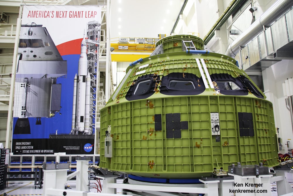This particular 'Lunar Orion' crew module is intended for blastoff to the Moon in 2018 on NASA's Exploration Mission-1 (EM-1) atop the agency's mammoth new Space Launch System (SLS) rocket, simultaneously under development. The pressurized crew module serves as the living quarters for the astronauts comprising up to four crew members.