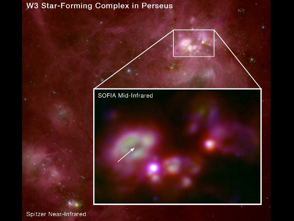 The massive stars are still enshrouded in the gas cloud from which they formed, a region located in the direction of Perseus called W3. The Faint Object Infrared Camera for the SOFIA Telescope (FORCAST) instrument was able to peer through the cloud and locate up to 15 massive young stars clustered together in a compact region, designated W3A.