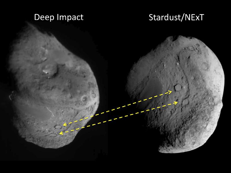[caption id="attachment_83348" align="aligncenter" width="580" caption="Tempel 1 Impact Site. This pair of images shows the before-and-after comparison of the part of comet Tempel 1 that was hit by the impactor from NASA's Deep Impact spacecraft. The left-hand image is a composite made from images obtained by Deep Impact in July 2005. The right-hand image shows arrows identifying the rim of the crater caused by the impactor. The crater is estimated to be 150 meters (500 feet) in diameter. This image also shows a brighter mound in the center of the crater likely created when material from the impact fell back into the crater. Credit: NASA/JPL-Caltech/University of Maryland/Cornell"]