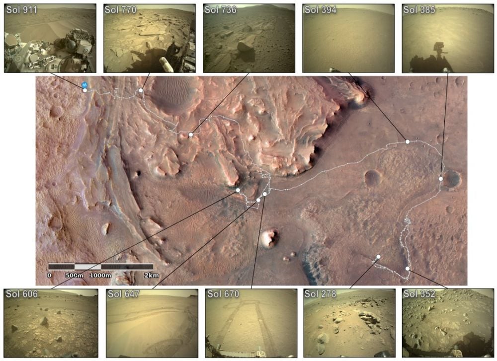 *Each white dot in this image represents one of the 264 panoramic images Perseverance captured in Jezero Crater. They capture the rover's entire mission up to Sol 911 as travelled through multiple terrain types. Image Credit: Nash et al. 2026. ICRA*