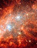 Image credit: Hubble The nearby dwarf galaxy NGC 1569 is a hotbed of vigorous star birth activity which blows huge bubbles that riddle the main body of the galaxy. The galaxy's "star factories" are also manufacturing brilliant blue star clusters. This galaxy had a sudden onset of star birth about 25 million years ago, which subsided about the time the very earliest human ancestors appeared on Earth.