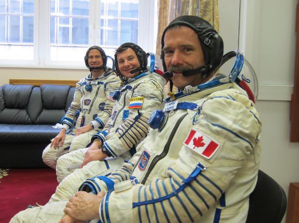 Hadfield, Marshburn and Romanenko during their final Soyuz sim on Earth. Credit: NASA